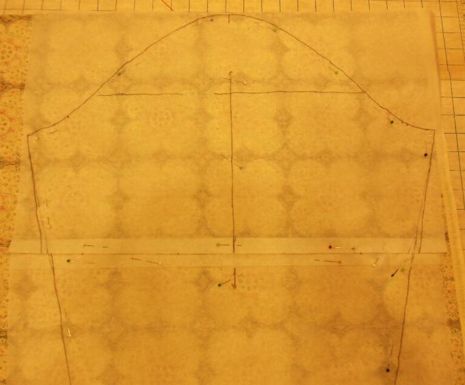 It wasn't very wide so I had to lay it out flat in order to cut out the sleeves. Speaking of sleeves, those were a bit of a mess to adjust and pin. The parchment paper was pieced right on the "lengthen or shorten" line.